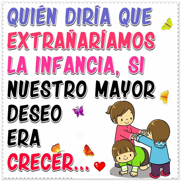 Quien diría que extrañaríamos la infancia, si nuestro mayor deseo era crecer. La infancia es el primer período de la vida de la persona, comprendido entre el nacimiento y el principio de la adolescencia. La infancia o niñez es un término amplio aplicado a los seres humanos que se encuentran en fases de desarrollo comprendidas entre el nacimiento y la adolescencia o pubertad. no hay que hablar de la infancia sino de las infancias.